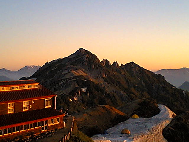 燕山荘直下はまだ残雪が残るが、スタッフの方々が